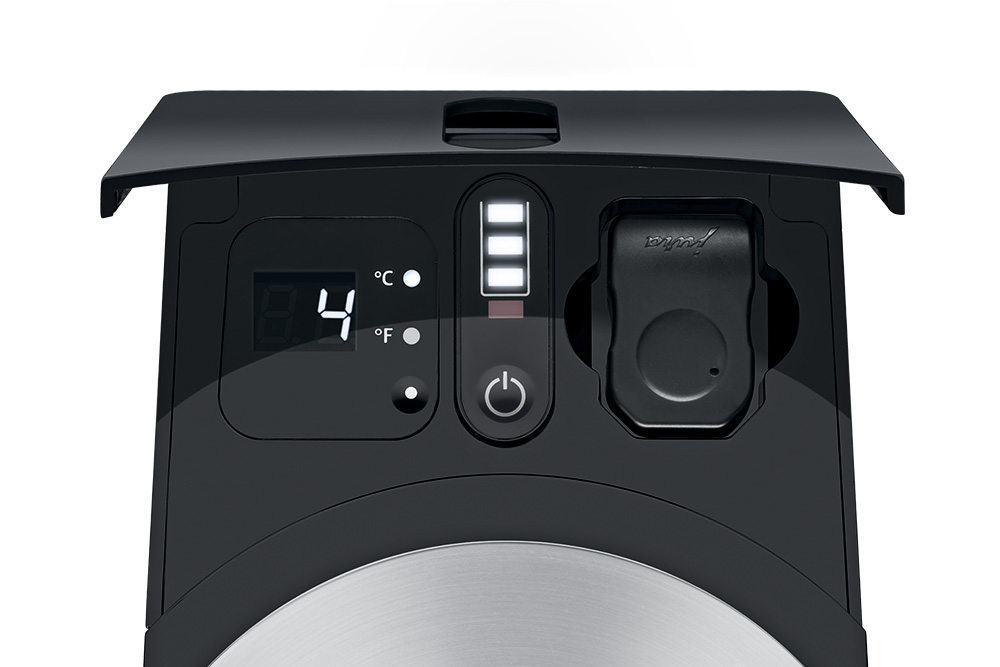 加入牛奶時無需取出內杯,數位溫度顯示及壓式上蓋的人性化功能,讓使用上更加方便快速。
