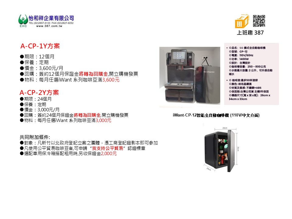 ●期限:12個月 ●保養:定期 ●價金:3,600元/月 ●回購:簽約12個月保證金將轉為回購金,開立購機發票 ●物料:每月任選iWant 系列咖啡豆滿3,600元 ●對象:凡新竹以北政府登記立案之團體,憑工商登記證影本即可參加 ●凡使用公平貿易咖啡豆者,可申請“我支持公平貿易”認證標章 ●選配車用保冷箱搭配租用時,另收保證金2,000元
